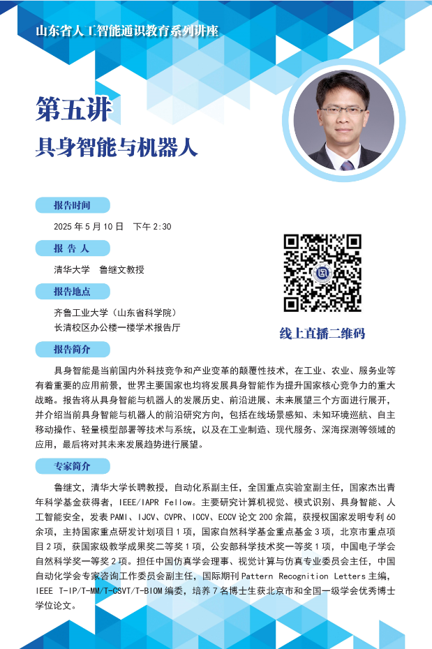 现组织我校师生学习收看山东省人工智能通识教育系列讲座第五讲,本次讲座特邀清华大学长聘教授鲁继文以“具身智能与机器人”为题展开深入讲解。