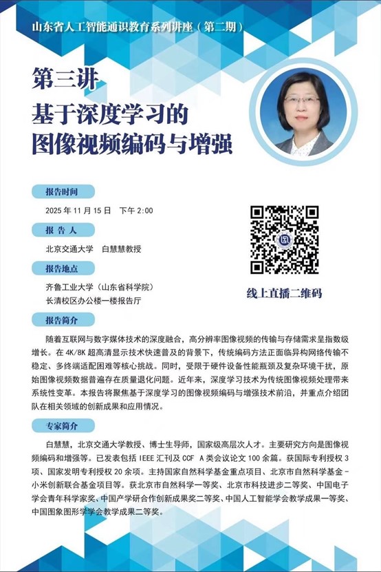 现组织我校师生学习收看山东省人工智能通识教育系列讲座(第二期)第三讲,本次讲座特邀北京交通大学白慧慧教授,以“基于深度学习的图像视频编码与增强”为题进行专题分享。